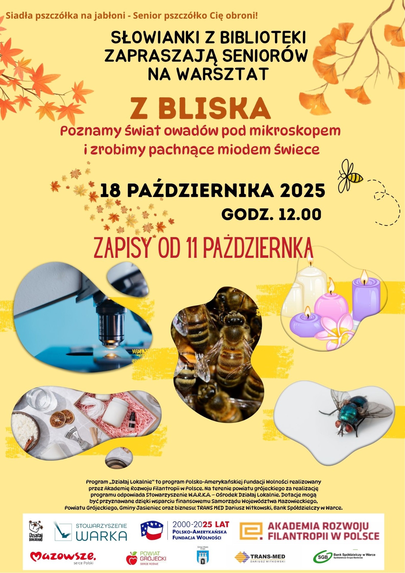 Serdecznie zapraszamy do zapisów na warsztaty dla Seniorów "Z bliska" realizowanych w ramach projektu "Siadła pszczółka na jabłoni - Senior pszczółko Cię obroni!".