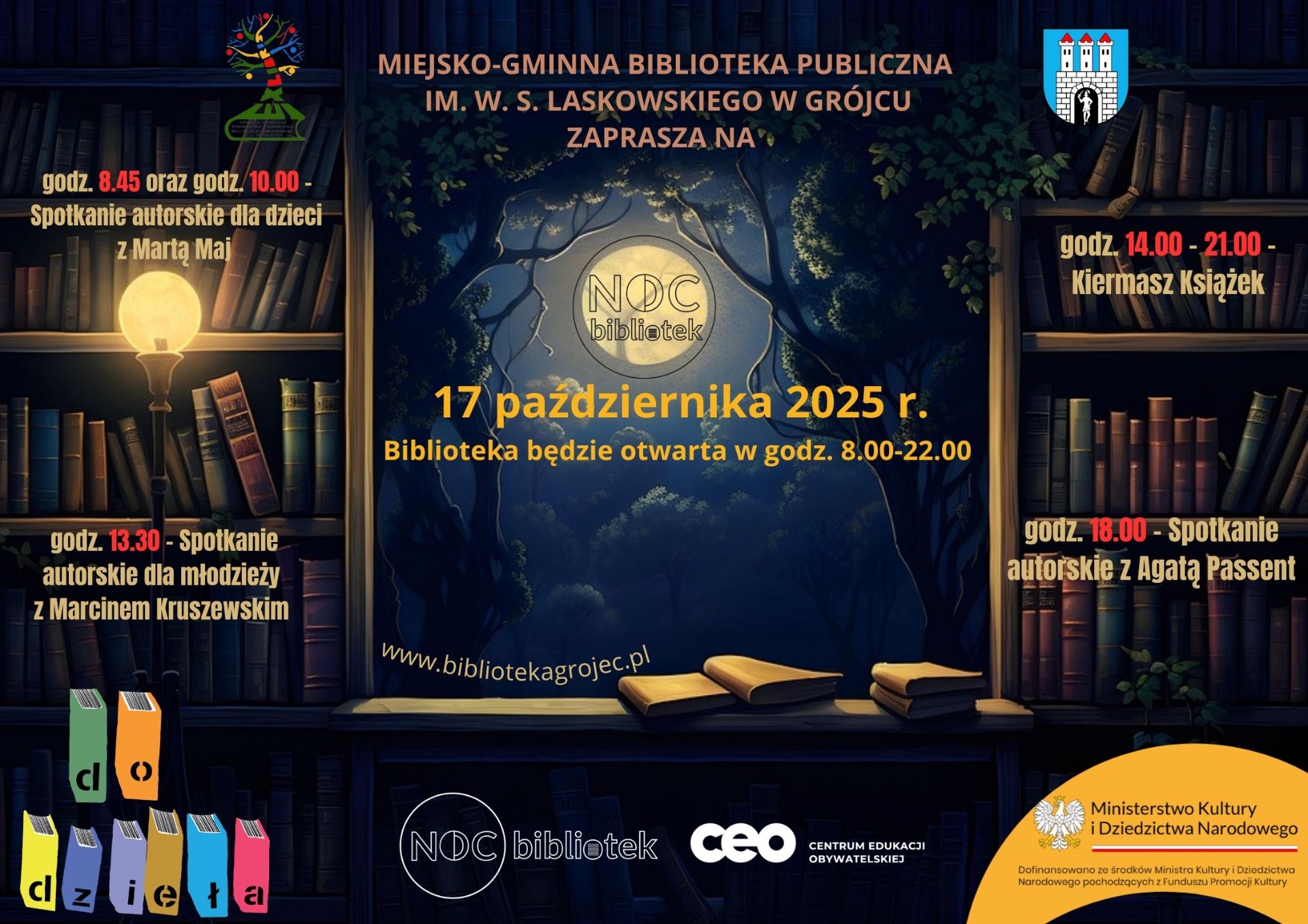 Miejsko-Gminna Biblioteka Publiczna w Grójcu serdecznie zaprasza na wyjątkowe święto miłośników książek i kultury – Noc Bibliotek 2025, która odbędzie się w piątek, 17 października, w godzinach 8:00–22:00.