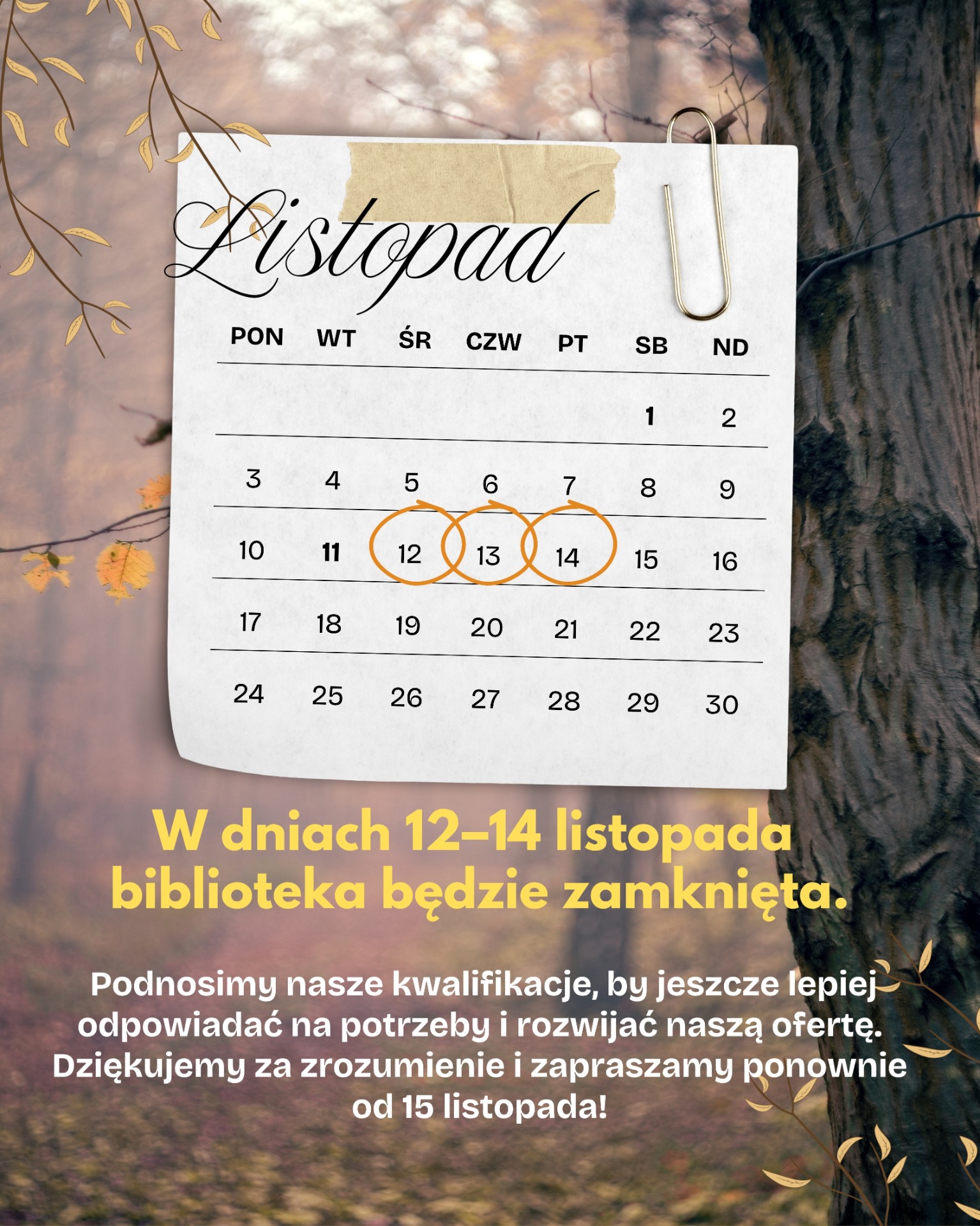 W dniach 12–14 listopada 2025 roku nasza biblioteka będzie zamknięta.