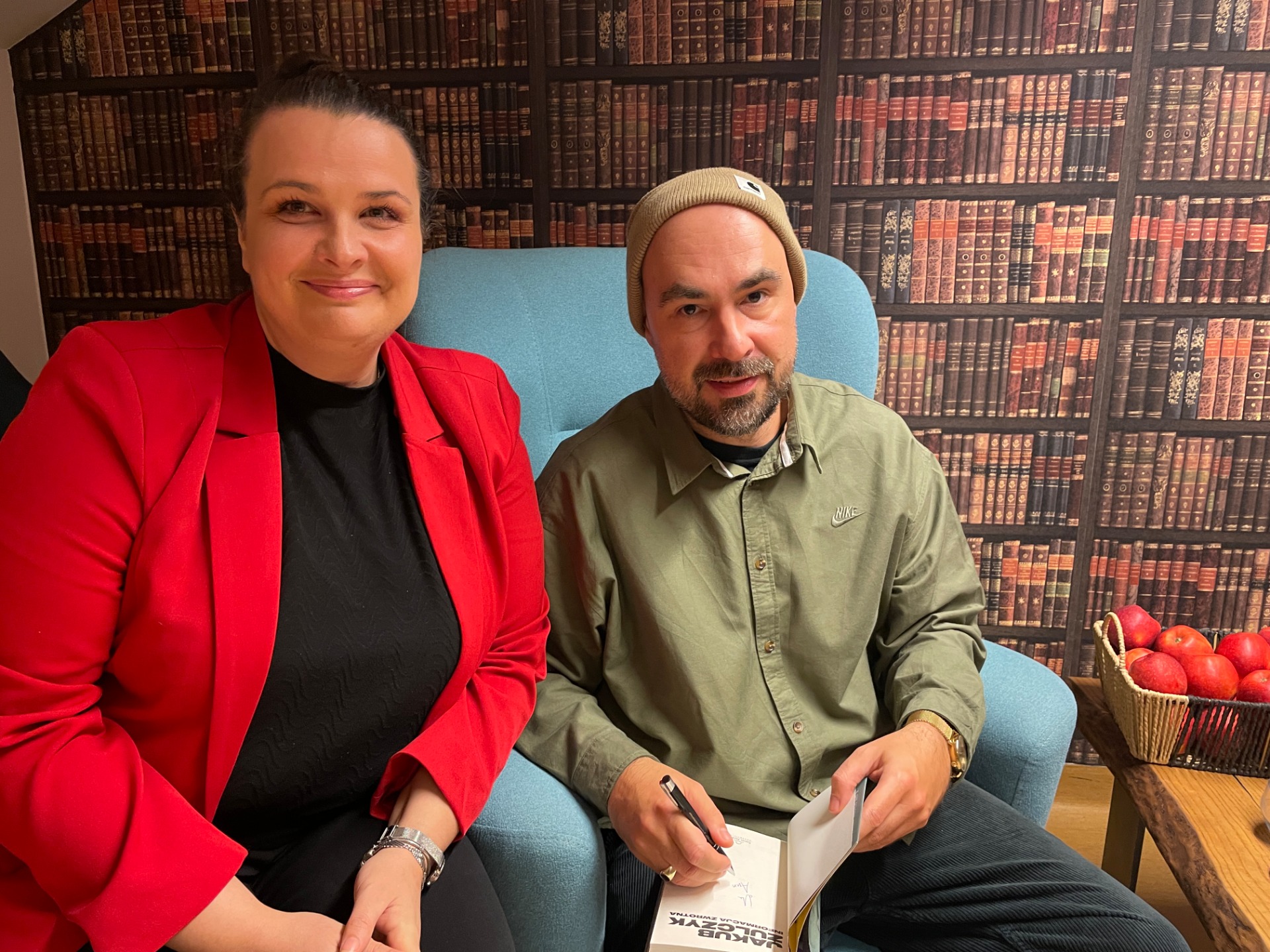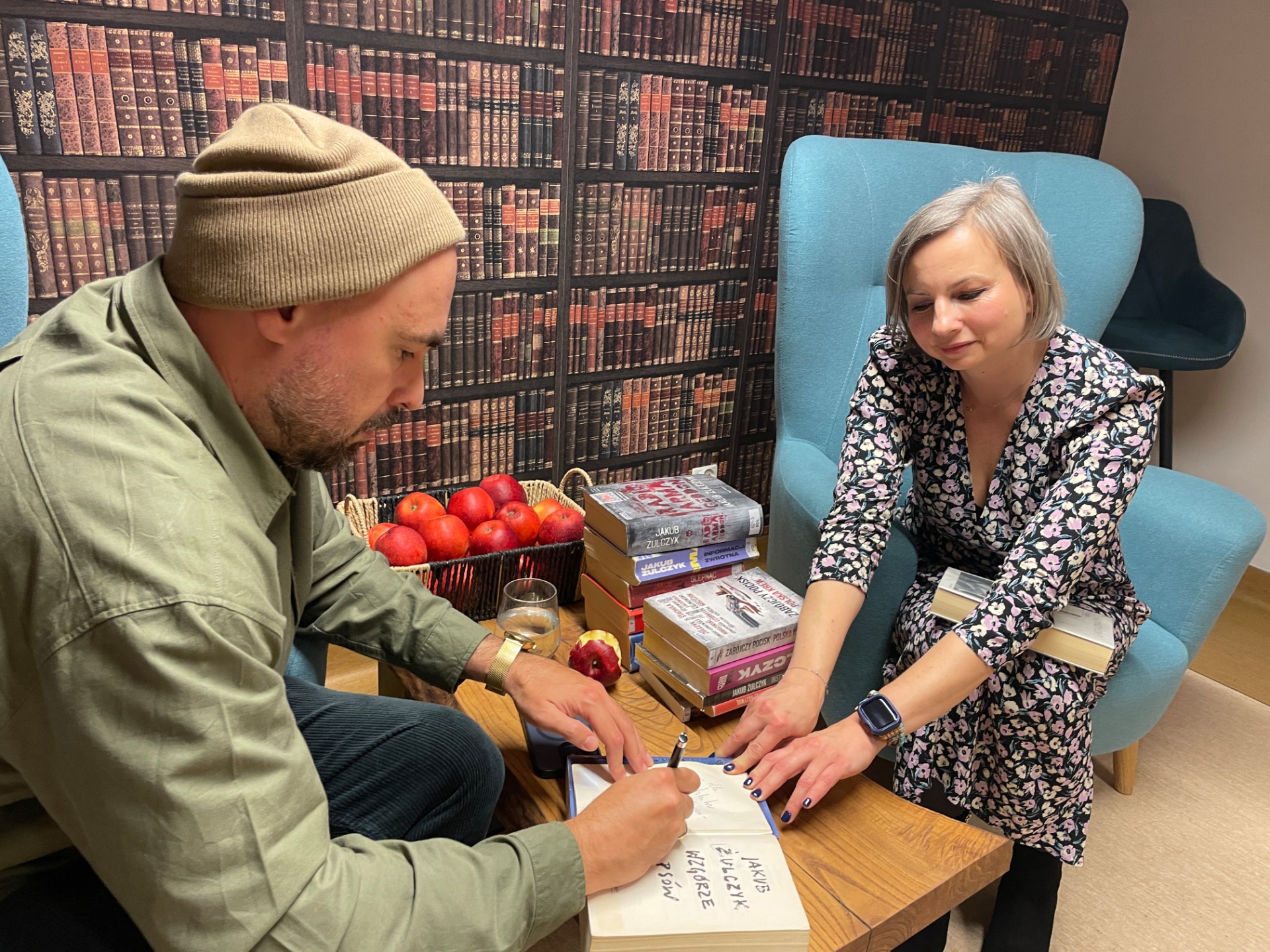 Niektóre spotkania zaczynają się spokojnie, a dopiero później nabierają tempa. To z Jakubem Żulczykiem 19 listopada w grójeckiej bibliotece wystartowało jak dobrze naoliwiona maszyna: żywo, dowcipnie i tak naturalnie, że od pierwszych sekund sala była po jego stronie. Pisarz powitał uczestników krótkim „Dzień-do-bry”, po czym z uśmiechem dodał: „Macie tu naprawdę ładne jabłka…”. Kilka osób przytaknęło, kilka wybuchło śmiechem, a atmosfera natychmiast zrobiła się taka, jak lubimy najbardziej: swojska i bez zadęcia.