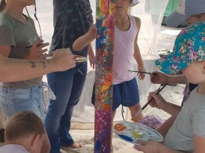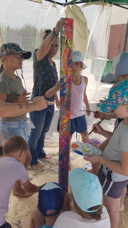 i służą dzieciom jako stoły podczas zajęć. Ponieważ miejsce jest eksponowane należało je osłonić przed wiatrem, deszczem i prażącym słońcem. Tym zajęli się harcerze z Hufca ZHP Grójec pod przewodnictwem Przemysława Mikulskiego, którzy przywieźli i rozstawili altanę. Przydał się również wielki parasol przeciwsłoneczny, wypożyczony przez pracownika biblioteki – p. Kasię Bieleń. Kajak na Wyspę dowiózł, z wareckiej Wypożyczalni Ster, Witold Batte. Zezwolił także na jego „upiększenie”. I znów realizatorzy projektu mogli polegać na wolontariuszach. Harcerki ze 117. Drużyny Starszoharcerskiej SZCZYT: Joanna Jaroszyńska, Aleksandra Radecka i Marta Truszkowska pomalowały kajak.