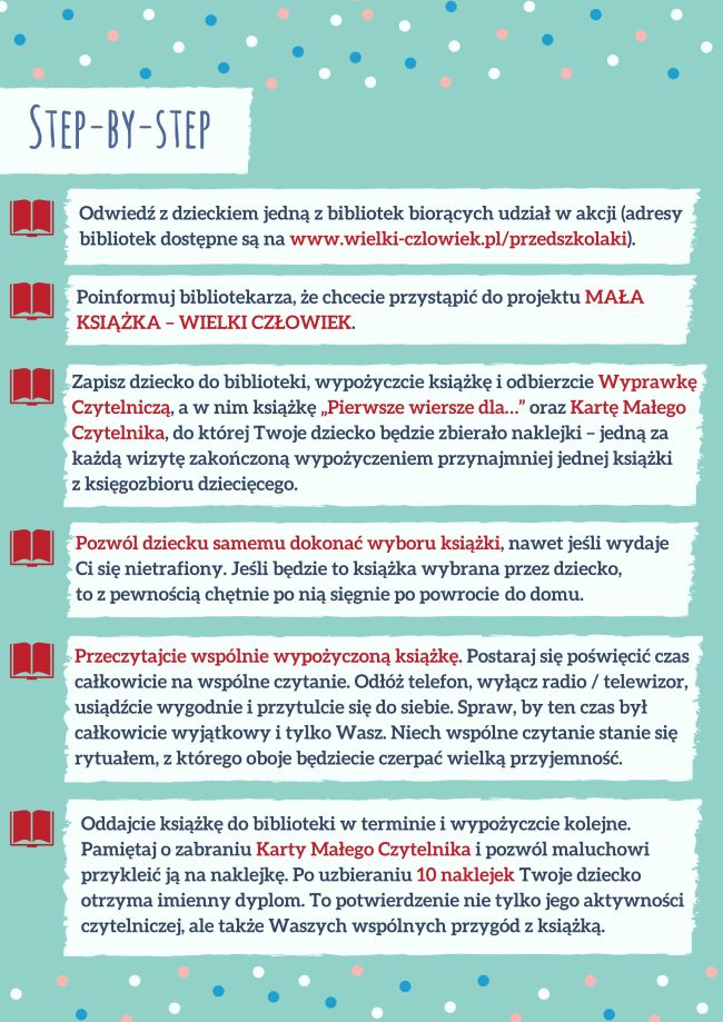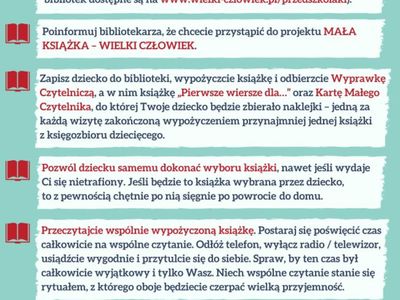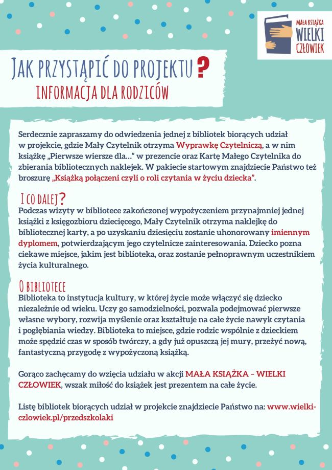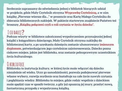 Pilotażowy projekt dla trzylatków realizowany w ramach ogólnopolskiej kampanii „Mała książka - wielki człowiek” rozpocznie się we wrześniu 2018 roku. Akcja ma zachęcić rodziców do odwiedzania bibliotek i codziennego czytania z dzieckiem. Każdy trzylatek, który przyjdzie do biblioteki, otrzyma w prezencie Wyprawkę Czytelniczą, a w niej: książkę „Pierwsze wiersze dla…” oraz Kartę Małego Czytelnika. Za każdą wizytę w bibliotece zakończoną wypożyczeniem minimum jednej książki z księgozbioru dziecięcego Mały Czytelnik otrzyma naklejkę, a po zebraniu dziesięciu zostanie uhonorowany imiennym dyplomem potwierdzającym jego czytelnicze zainteresowania. W Wyprawce znajdą coś dla siebie także rodzice. „Książką połączeni, czyli o roli czytania w życiu dziecka” to broszura informacyjna, przypominająca o korzyściach wynikających z czytania dzieciom oraz podpowiadająca, skąd czerpać nowe inspiracje czytelnicze. Dzięki akcji dziecko pozna ważne miejsce na czytelniczej mapie dzieciństwa (bibliotekę) i zostanie pełnoprawnym uczestnikiem życia kulturalnego.