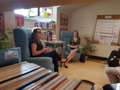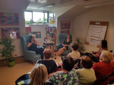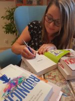 Spotkanie prowadziła Dyrektor Kinga Majewska, przebiegło ono w przesympatycznej atmosferze, w dużej mierze za sprawą poczucia humoru pisarki a także miejsca, nasza rozmówczyni podkreśliła niezwykłość i wyjątkowość tej przestrzeni pachnącej książkami. Zapytania Kingi Majewskiej ułożone zostały zmyślnie, pozwoliły autorce zaprezentować swoją twórczość, opowiedzieć jak rozpoczęła się jej przygoda z pisarstwem, skąd czerpie do niej inspiracje, do której swojej książki ma szczególny sentyment, o czym marzy….