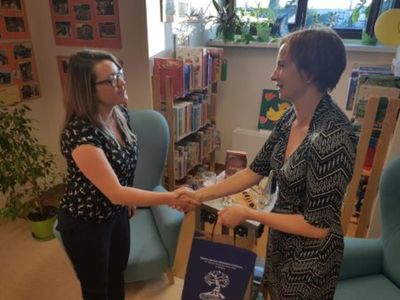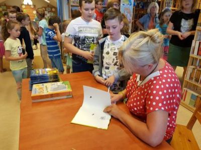 Dziękując za rozmowę Dyrektor Kinga Majewska wręczyła pisarce niedawno promowaną monografię naszej Biblioteki. Zainteresowani mieli możliwość otrzymania autografu z dedykacją autorki.