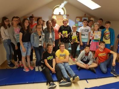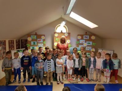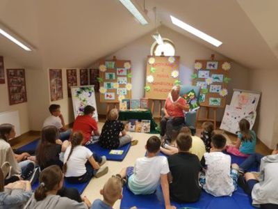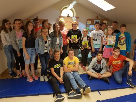 Spotkania w grójeckiej Bibliotece, na poddaszu zabytkowego budynku, zawsze bowiem mają wyjątkowy klimat. Tym razem miałam przyjemność spotkać się i z Przedszkolaczkami, i z Uczniami najstarszych klas szkoły podstawowej. Ale niejednocześnie, rzecz jasna! Pracownicy Biblioteki świetnie wiedzą, że takie dobranie treści spotkania, by trafiło ono w zainteresowanie Czytelników zróżnicowanych wiekowo, by dla nikogo nie było ani za trudne, ani za nudne, jest niemożliwe. Dlatego spotkania odbyły się w oddzielnych grupach, o różnych porach. I wyglądały zupełnie inaczej – z Maluszkami rozmawialiśmy o powstawaniu książki, o szukaniu na nią pomysłów, o pracy pisarza i ilustratora, o roli wydawcy. I bawiliśmy się – słowem, rymem, wierszem. Natomiast spotkanie z Młodzieżą to już była wyższa szkoła jazdy. Tu tematem była przede wszystkim grzeczność języka. A więc zagadnienie uniwersyteckie – z Uczniami SP z Zaborowa rozmawiałam bowiem tak jak z moimi studentami na Uniwersytecie. Miło zaskoczyło mnie ich żywe zainteresowanie tematem, a przede wszystkim – duża świadomość językowa.