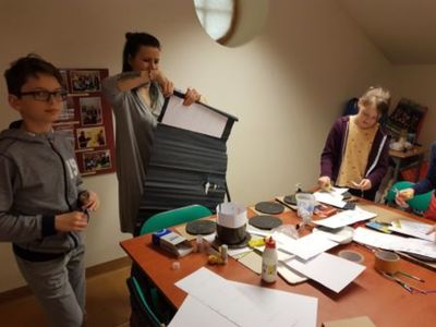 Zajęcia 23.01.2018 były projektem, który dotyczył zagadnień z zakresu optyki i ruchomych obrazów, tworzyliśmy ZOETROP czyli urządzenie będące pradziadkiem kinematografu. Dzięki wiedzy dotyczącej budowy i funkcjonowania ludzkiego oka, pokazując sekwencję nieruchomych obrazów z odpowiednią prędkością otrzymujemy wrażenie ruchu. Zoetrop ma postać cylindra na obracającej się podstawie, na którego wewnętrznej ścianie tworzyliśmy nasze obrazy a powyżej dookoła wycinaliśmy szpary do podglądania. Wprawiając urządzenie w ruch i obserwując przez szparę widzimy pędzącą panterę, skaczącego kota lub lecącą wronę :)