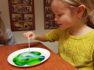 23.01.2018 Zajęcia rozpoczęły się od zapoznania dzieci z zasadami BHP dotyczącymi pracy ze sprzętem laboratoryjnym i związkami chemicznymi. Następnie wspólnie wykonaliśmy doświadczenie „chemiczny ogród” polegające na wytwarzaniu przez kolorowe sole licznych „gałęzi” pod wpływem szkła wodnego, które wytwarzało półprzepuszczalną otoczkę. Czekając na efekty doświadczenia rozmawialiśmy o skali pH i odczynach kwasowo-zasadowych. Poznaliśmy różne odczynniki takie jak oranż metylowy, fenoloftaleina czy papierki lakmusowe. Dowiedzieliśmy sie, że każdy z nas ma w domu taki odczynnik którym jest np. herbata. Po tych badaniach każdy przeprowadził własny, kolorowy eksperyment z użyciem mleka, barwników spożywczych i płynu do mycia naczyń. Wspólnie bawiliśmy sie chemią tworząc kolorowe wzory na talerzykach, a przy tym dowiedzieliśmy sie co to takiego napięcie powierzchniowe. Na koniec zajęć podziwialiśmy jak „zakwitł” nasz chemiczny ogród.