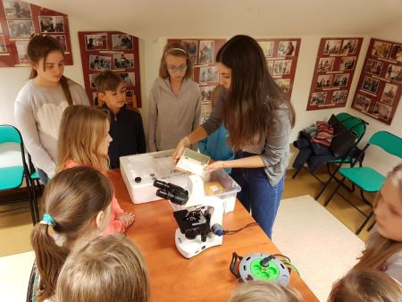 22.01.2018 W pierwszej części zajęć podzieliliśmy sie na dwie mniejsze grupy. Pierwsza z nich zgłębiła tajniki entomologii. Dowiedzieliśmy sie o warunkach życia i pokarmie jaki jedzą organizmy takie jak karaczan madagaskarski, patyczak, ptasznik kędzierzawy, świerszcze i wije. Nie była to sucha wiedza, lecz każde dziecko mogło z bliska przyjrzeć sie zwierzęciu, a nie które z nich wziąć na ręce. Na to zdecydowali sie tylko najodważniejsi czy może najciekawsi z nas. Druga grupa mogła poznać tajniki korzystania z mikroskopu. Dzieci poznały zasady działania tego urządzenia, mogły przebierać spośród wielu preparatów takich jak skrzydło muchy domowej czy aparat gębowy motyla. Po zamianie stanowisk przez obie grupy wszyscy wspólnie stworzyliśmy własne ptaszniki zrobione z plasteliny, które przy małej pomocy utkały swoją sieć z gorącego kleju, kawałka kartonu i folii aluminiowej.