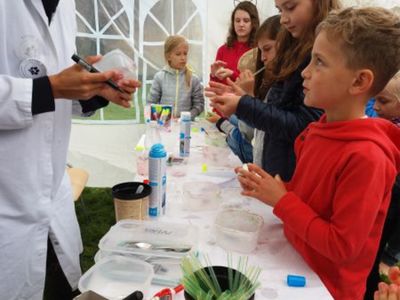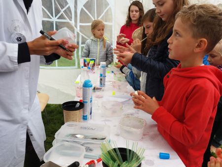i wrócić na początek. Tylko kilku osobom udało się pokonać to wyzwanie bez upuszczenia jajka. Brawa dla nich! W międzyczasie można było poeksperymentować z Tropami Przyrody. Dzieci na warsztatach glutologii wykonywały interesujące doświadczenia. Samodzielnie mieszały wszystkie składniki mikstury, oczywiście pod czujnym okiem pani z Tropów Przyrody. Warsztaty wzbudziły bardzo duże zainteresowanie, dlatego kolejka do zrobienia kolorowego „tworka” była dość długa. Każdy chciał spróbować.