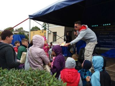 i wyposażenie samochodu strażackiego. Pozwolili także przymierzyć strój do akcji ratowniczej. Na koniec imprezy przyszedł czas na wyróżnienie dzieci, które najaktywniej uczestniczyły w warsztatach i zajęciach w Bibliotece. Nagrody otrzymało 8 osób, 7 kolejnych osób dostało upominki za poprawne rozwiązanie krzyżówki wakacyjnej. Wręczał je Paweł BIBA Binkiewicz we własnej osobie. Rozdano także nagrody loteryjne.