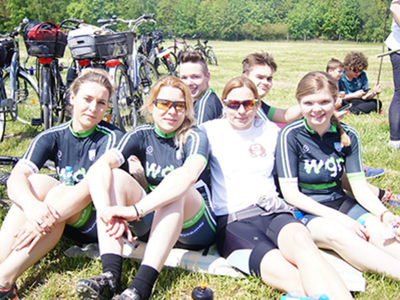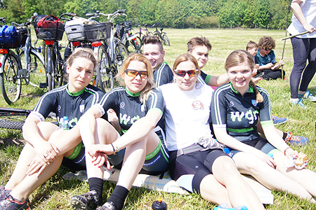 z cyklistami. Swoją obecnością zaszczycili nas Wójt Gminy Belsk Duży pan Władysław Piątkowski, Przewodniczący Rady Gminy pan Bogusław Sikorski, Przewodnicząca Komisji Oświaty pani Ewa Łubińska, Sekretarz Urzędu Gminy pani Renata Ostatek i Zastępca Skarbnika Gminy - pani Hanna Grotek. Po krótkim odpoczynku i słodkim poczęstunku wszyscy, w liczbie prawie 70 osób udali się do Małej Wsi na ognisko i wspólne pieczenie kiełbasek. Słońce przygrzewało, toczyły się rozmowy. Czas płynął szybko. Można byłoby wracać do Grójca. Jednak w planie wycieczki mieliśmy jeszcze zwiedzanie Pałacu w Małej Wsi - jednego z najpiękniejszych zabytków polskiego klasycyzmu.