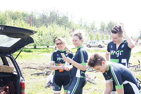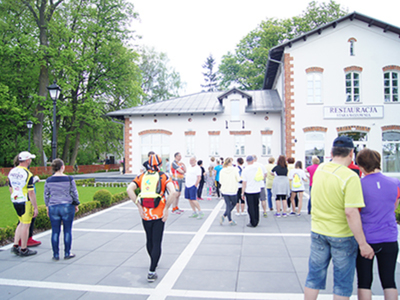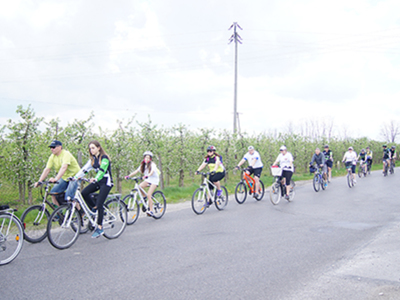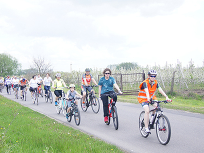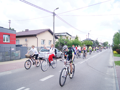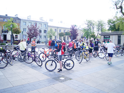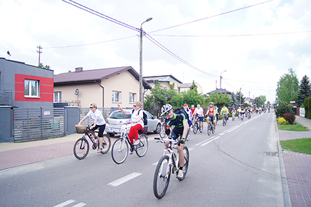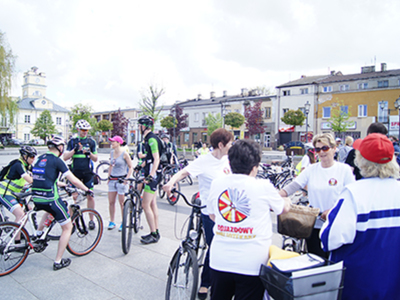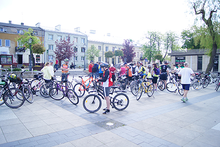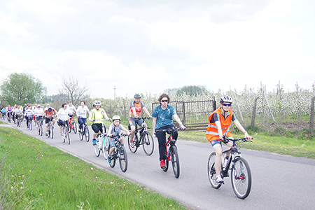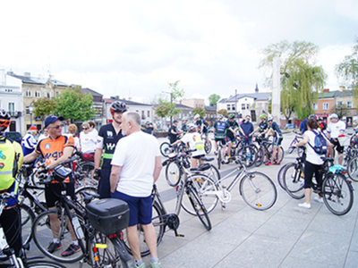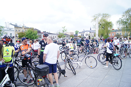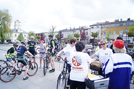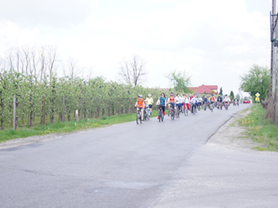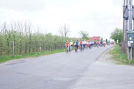 w Belsku Dużym oraz Pałacu w Małej Wsi. Mimo, że dzień zapowiadał się pięknie, w miejscu zbiórki na grójeckim rynku pojawiło się zaledwie kilka osób. Tak było o 9.30. Zaledwie kilka minut później przy „latającym jabłku” zrobiło się tłoczno. Traktem Królewskim, zewsząd otoczeni kwieciem jabłoni ruszyliśmy do Lewiczyna. Ten odcinek nie jest długi. Po kilku kilometrach było już widać wieżę Sanktuarium Matki Bożej. Tylko jeszcze jeden podjazd