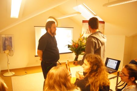 I tylko czas szybko mijał goniąc nieznośnie do przodu ku końcowi spotkania, które też nadeszło chyba w sumie zbyt szybko. Prelegent nagrodzony został brawami i bukietem kwiatów oraz umówił się z nami na kolejne spotkanie. Tym razem wcale nie historyczne, a dotyczące tematyki Fantazy i fantastyki. Powinno być równie ciekawie i serdecznie zapraszamy. Już niedługo Adam Podlewski ukończy też swe kolejne opowiadanie w klimacie postapokalipsy, której pewna część rozgrywać się będzie w Grójcu właśnie.