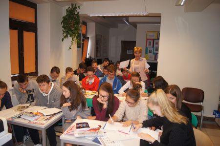 W tej lekcji uczestniczyły już 4 grupy, które poznawały rozwój pisma na różnych kontynentach, od znaków symbolicznych poprzez piktogramy, aż do pisma alfabetycznego, którym posługuje się większość języków europejskich.