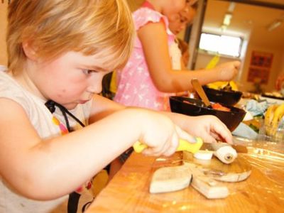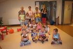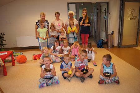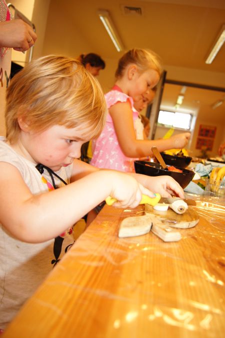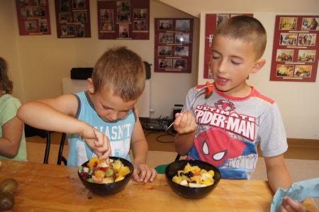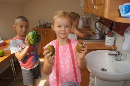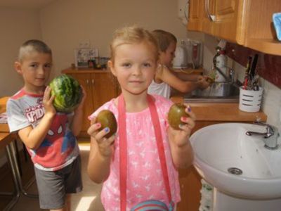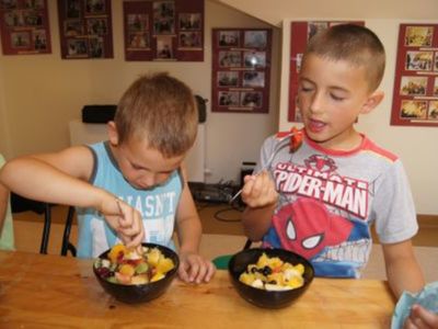 Zajęcia rozpoczęliśmy quizem o owocach, dowiedzieliśmy się gdzie rosną poszczególne owoce i jakie mają witaminy. Pani Magda powiedziała kilka słów o owocach znajdujących się na stole. Po dokładnym wyszorowaniu rąk i myciu owoców przystąpiliśmy do obierania, krojenia i siekania. Do wyboru było sporo owoców sezonowych jak i rosnących za granicą importowane do Polski. Do wyboru były takie owoce jak: kiwi, arbuz, melon, mango, porzeczki, banany, winogrona, cytryny. Dzieci zadecydowały, że będą pracować nad sałatkami w parach. Mamy pomagały w trudniejszych czynnościach. Powstało dużo kolorowych sałatek, każdy posiłek by wyjątkowy i niepowtarzalny. Dzieci zajadały aż uszy się trzęsły.