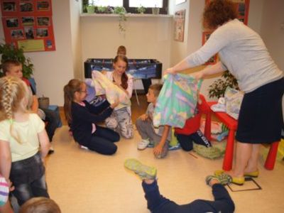 Z pościelą walczymy za każdym razem, kiedy ścielimy łóżko. Zawsze coś się przesunie, albo rogi wyjdą z poduszki albo powłoczka z kołdry się zsunie. Na zajęciach dzieci miały możliwość nauki oblekania pościeli. To naprawdę trudna sztuka ale uczestnicy warsztatów jak zwykle dali sobie radę.
