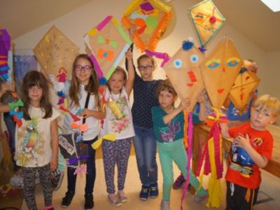 W Bibliotece Dziecięcej uczestnicy warsztatów tworzyli swoje barwne ptaki z listewek i szarego papieru. Do nich dołączali długie, kolorowe ogony ze sznurka i bibuły. I tak powstały przepiękne latawce.