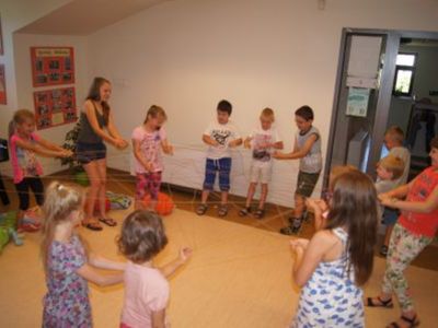 Wakacje w Bibliotece rozpoczęły się ciepło, śpiewająco i świetną zabawą. Pani Kasia, która prowadziła zajęcia przywiozła ze sobą gitarę by nauczyć uczestników kilku piosenek. Więc w cieniu drzewa rozbrzmiewały wesołe nutki. Po tym jak poruszone zostały nie tylko struny gitarowe ale także te w gardle był czas na zabawę. Piłka i gry podwórkowe dostarczyły dużej dawki radości i ruchu.